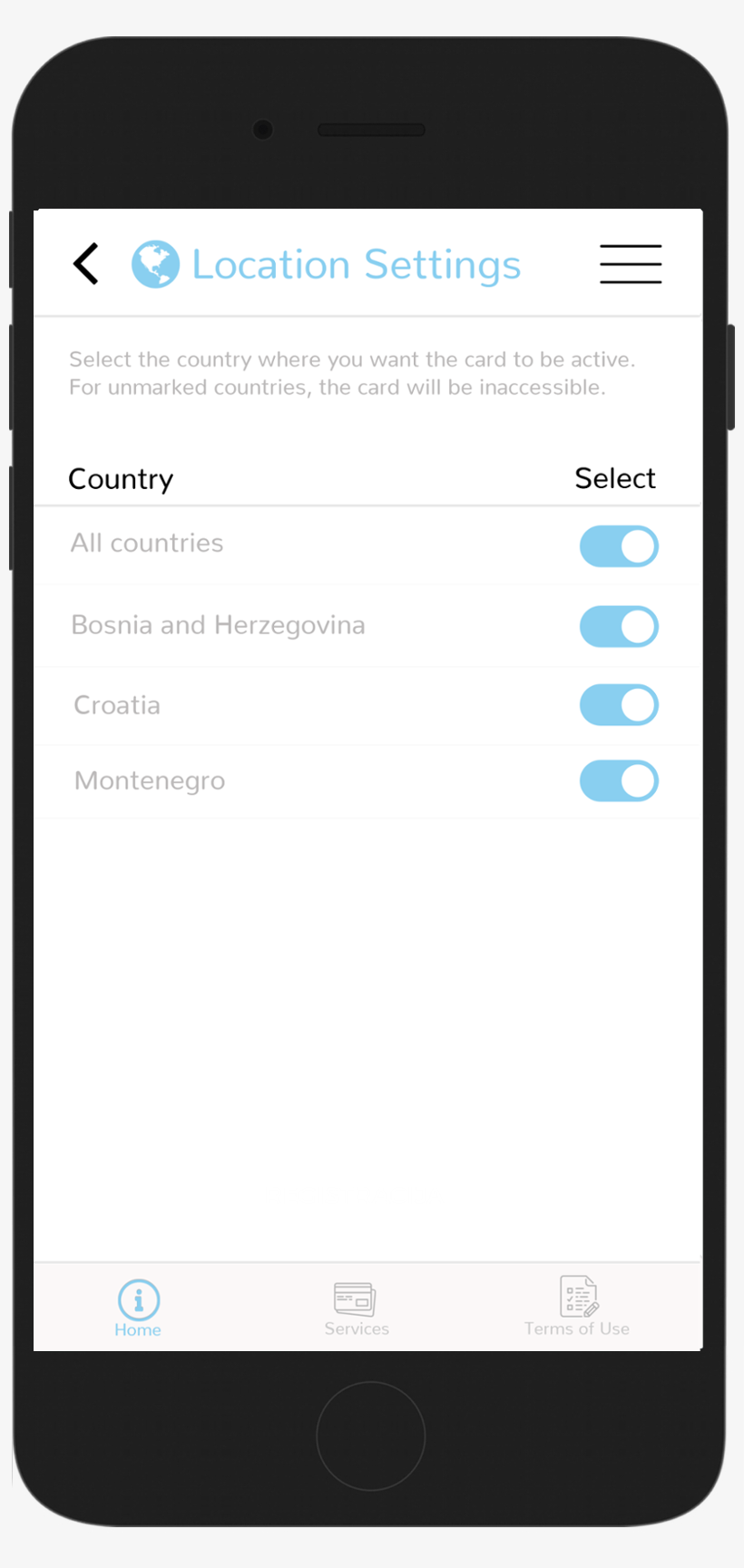 This menu enables you to select the countries in which the card will be active. The card will be disabled outside approved locations. If All States option has been choosed, the card will operate with out geografic boundaries.