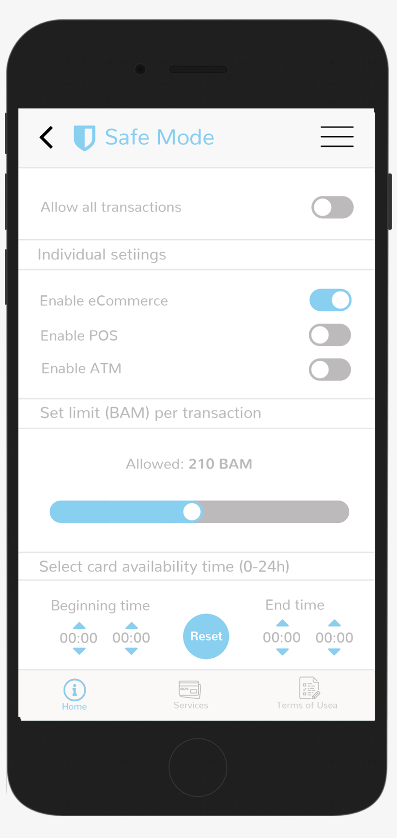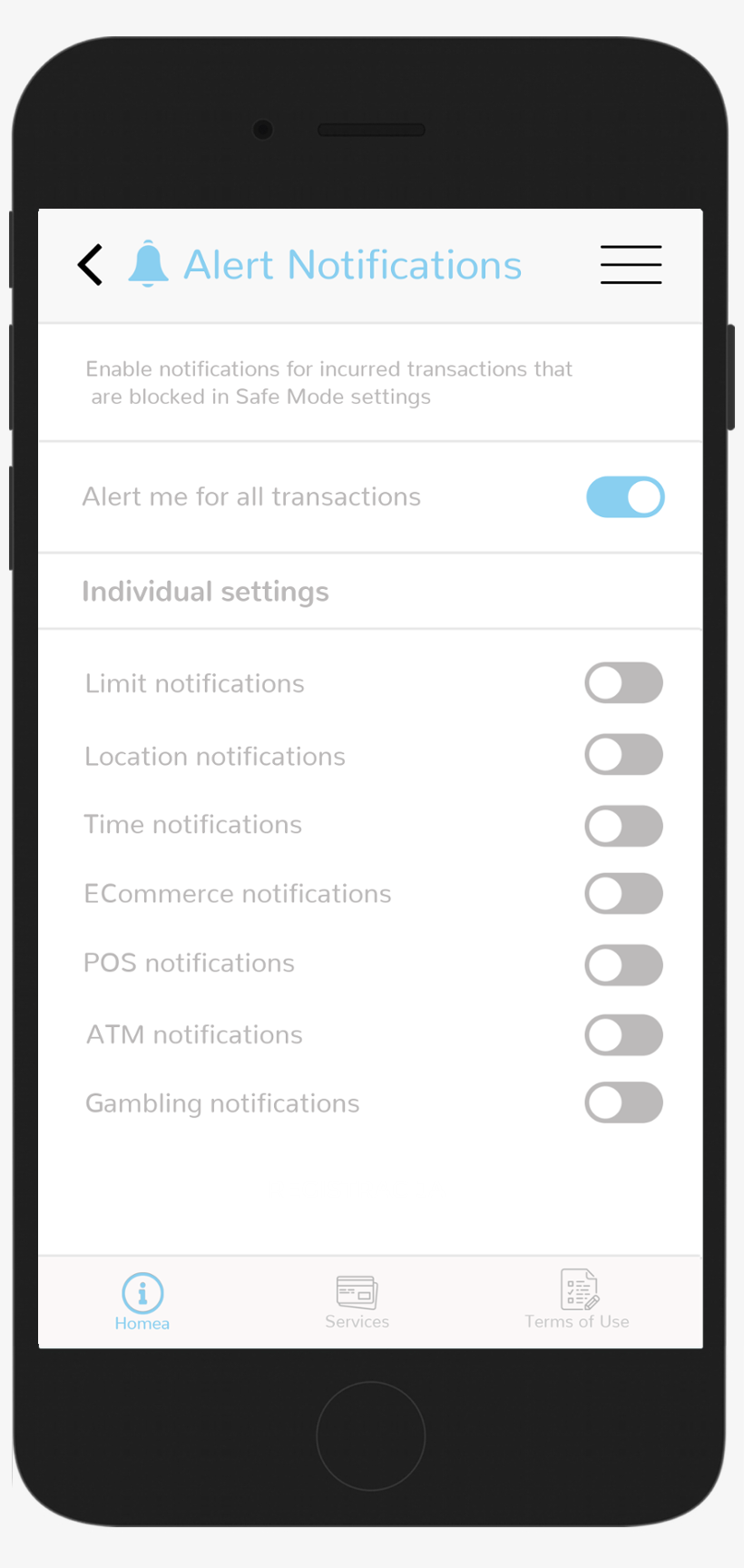 Finally, for each card option user can set to receive alerts. Alerts will be sent if any breaking-rule attempt is registrated related with the payment method, time, location, or exceeds the approved limit.