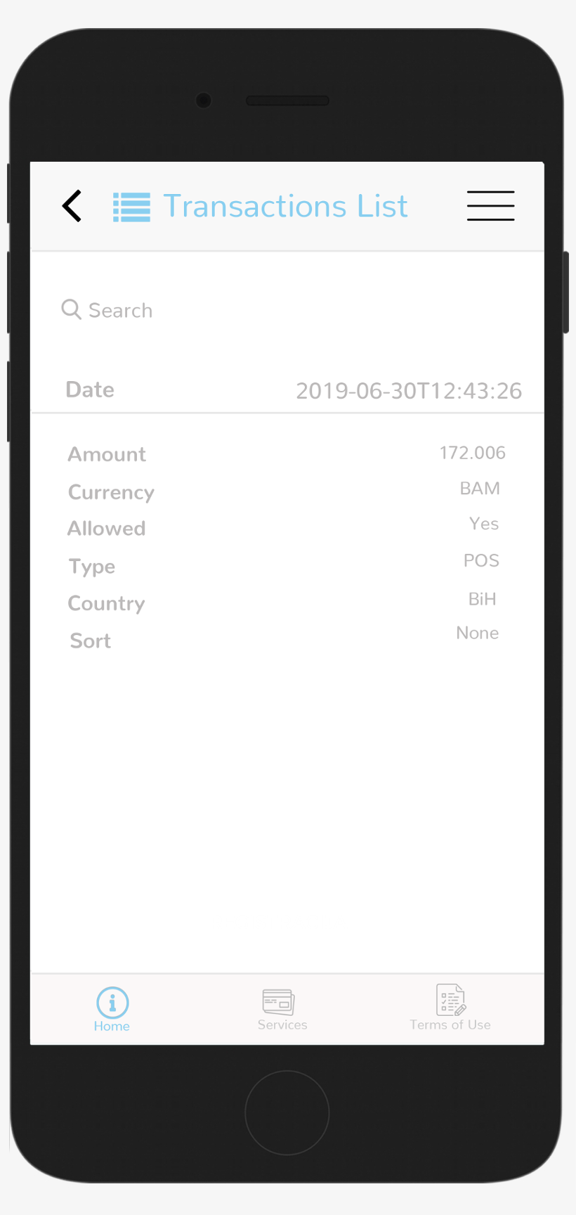 All transactions for every card are recorded in the application and could be viewed and searched in the Transaction list menu.